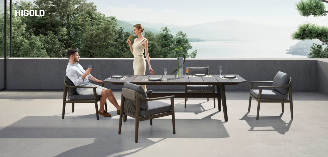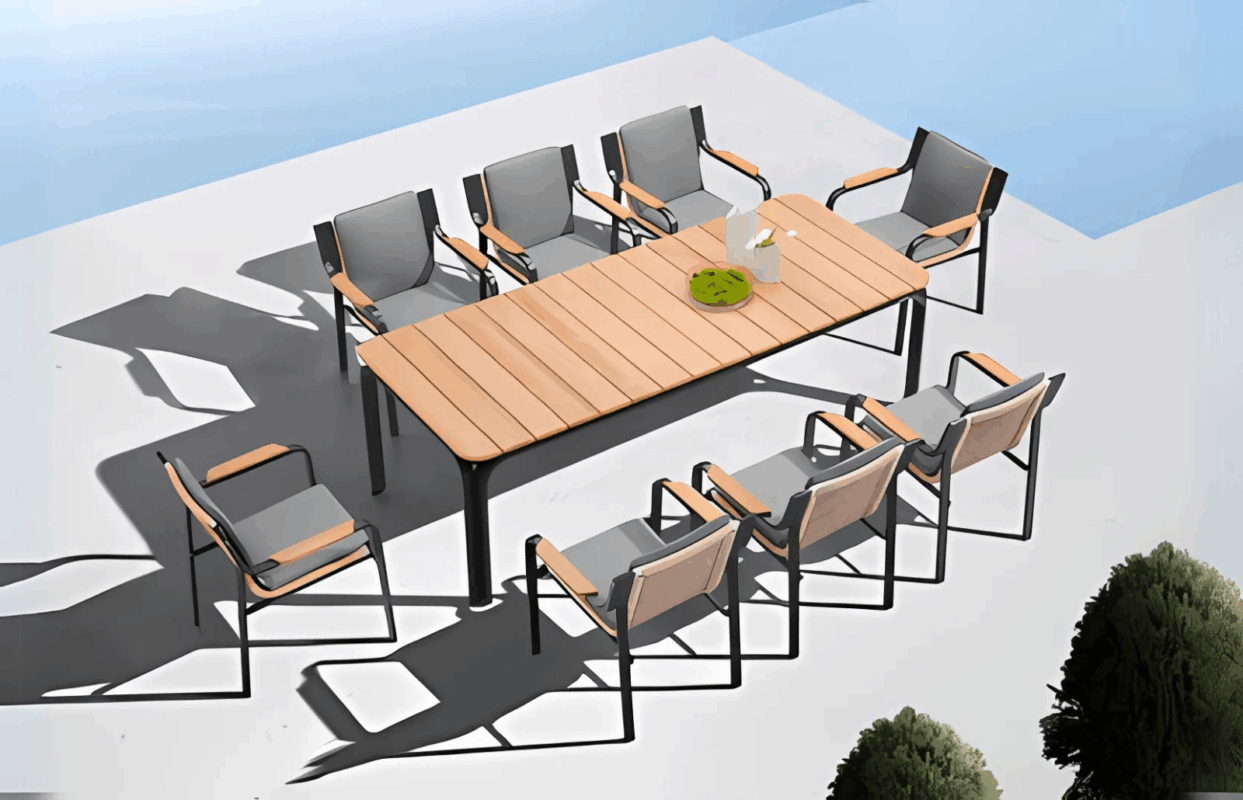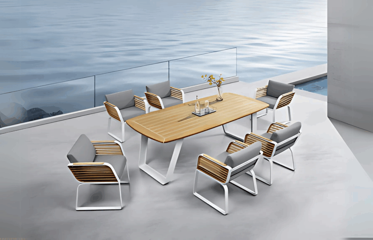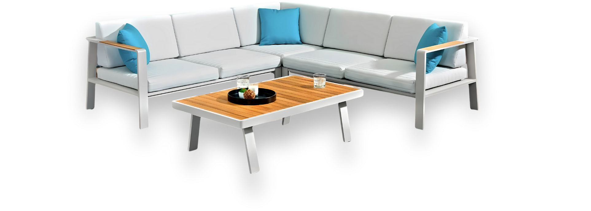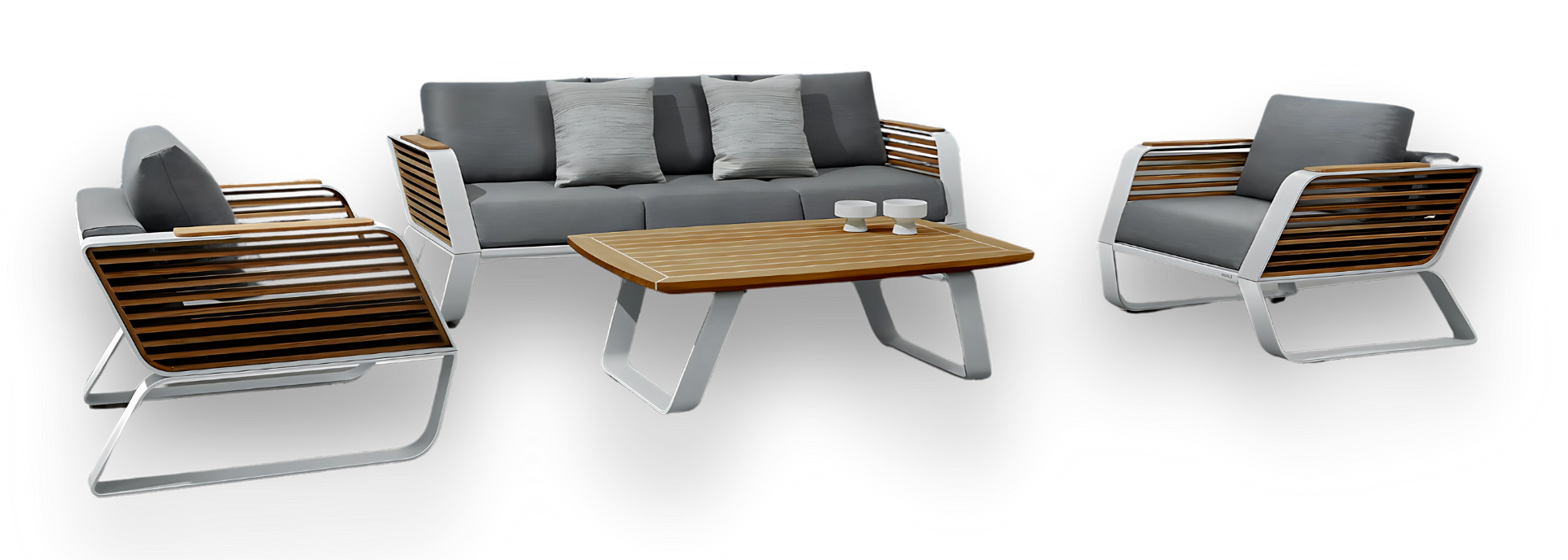 Алюминий, тик ағашы және ылғалға төзімді жастықтар оны террассалар, бақтар және кафелер үшін мінсіз етеді.