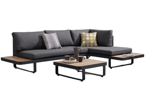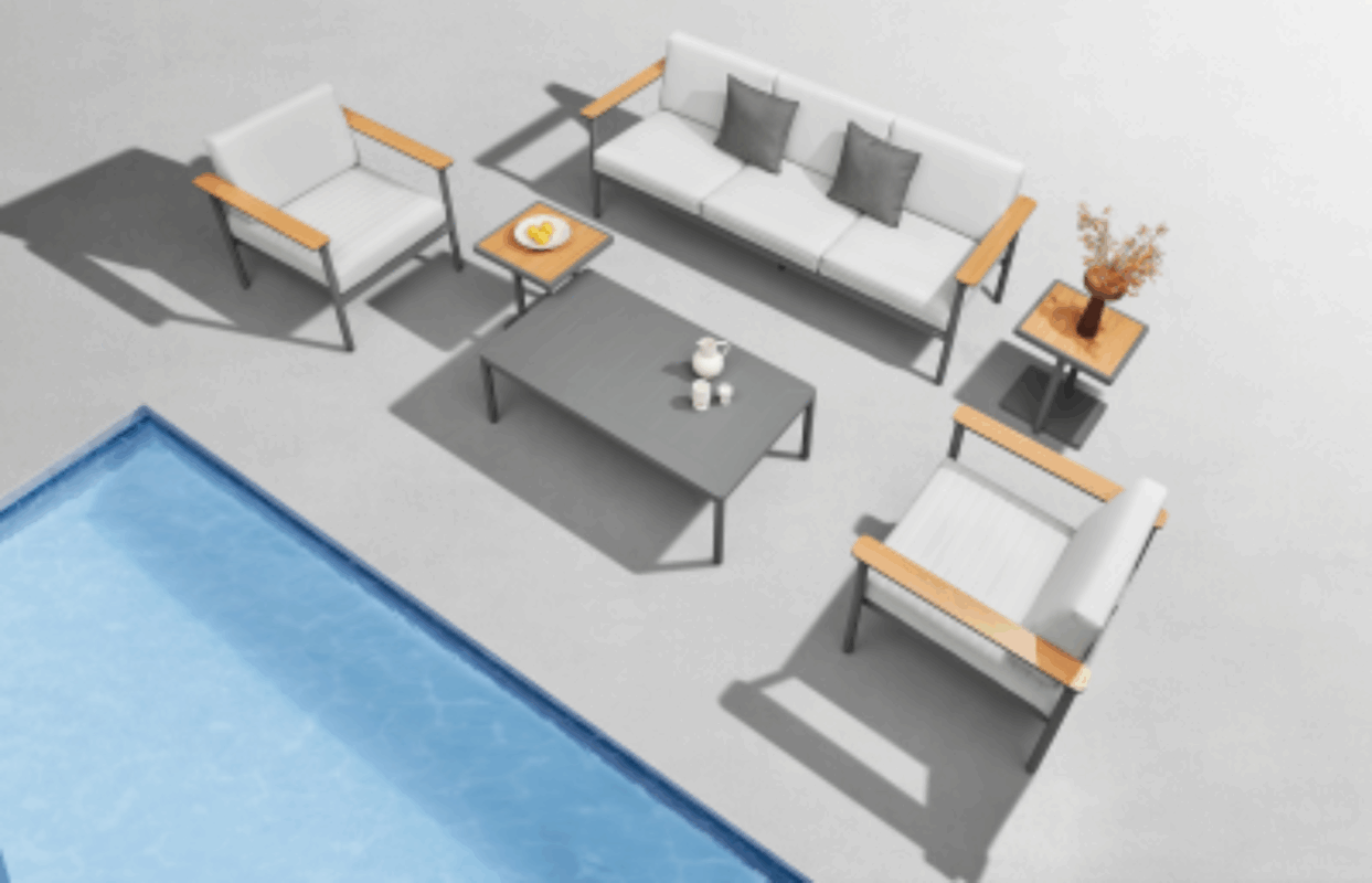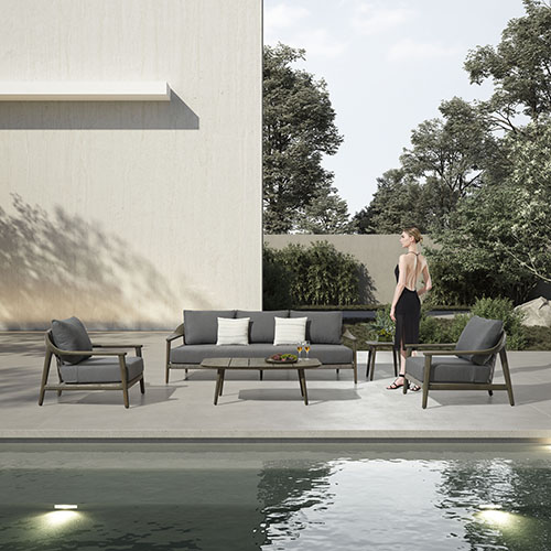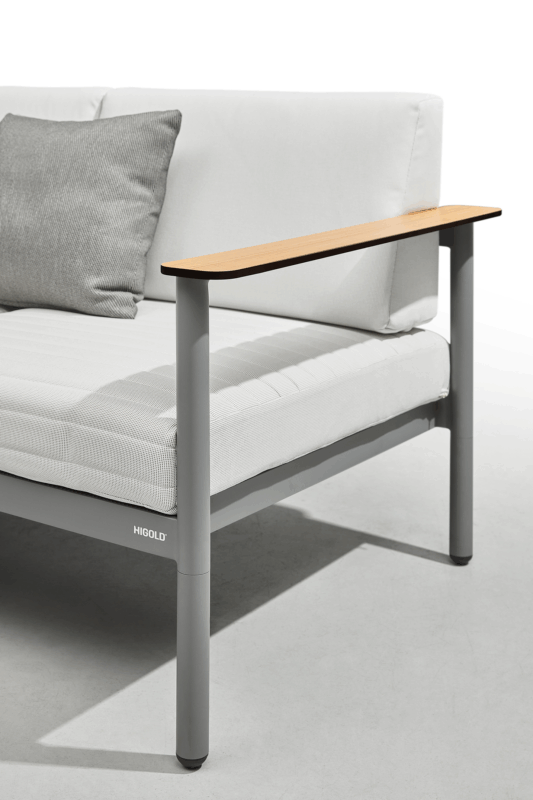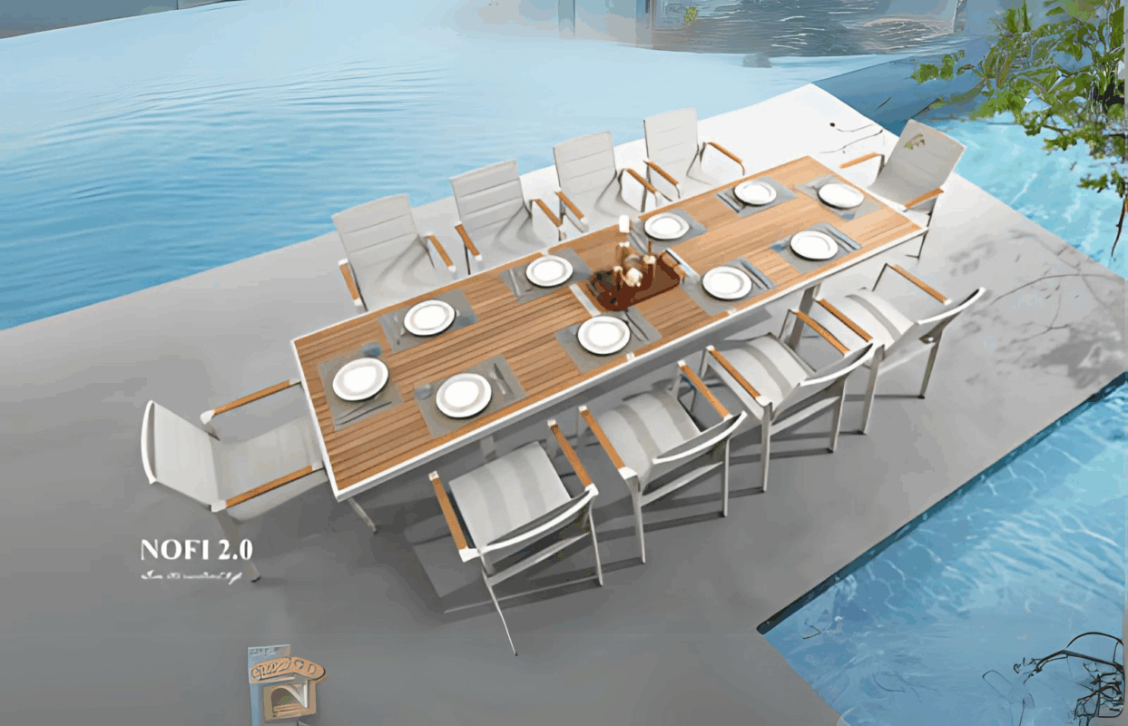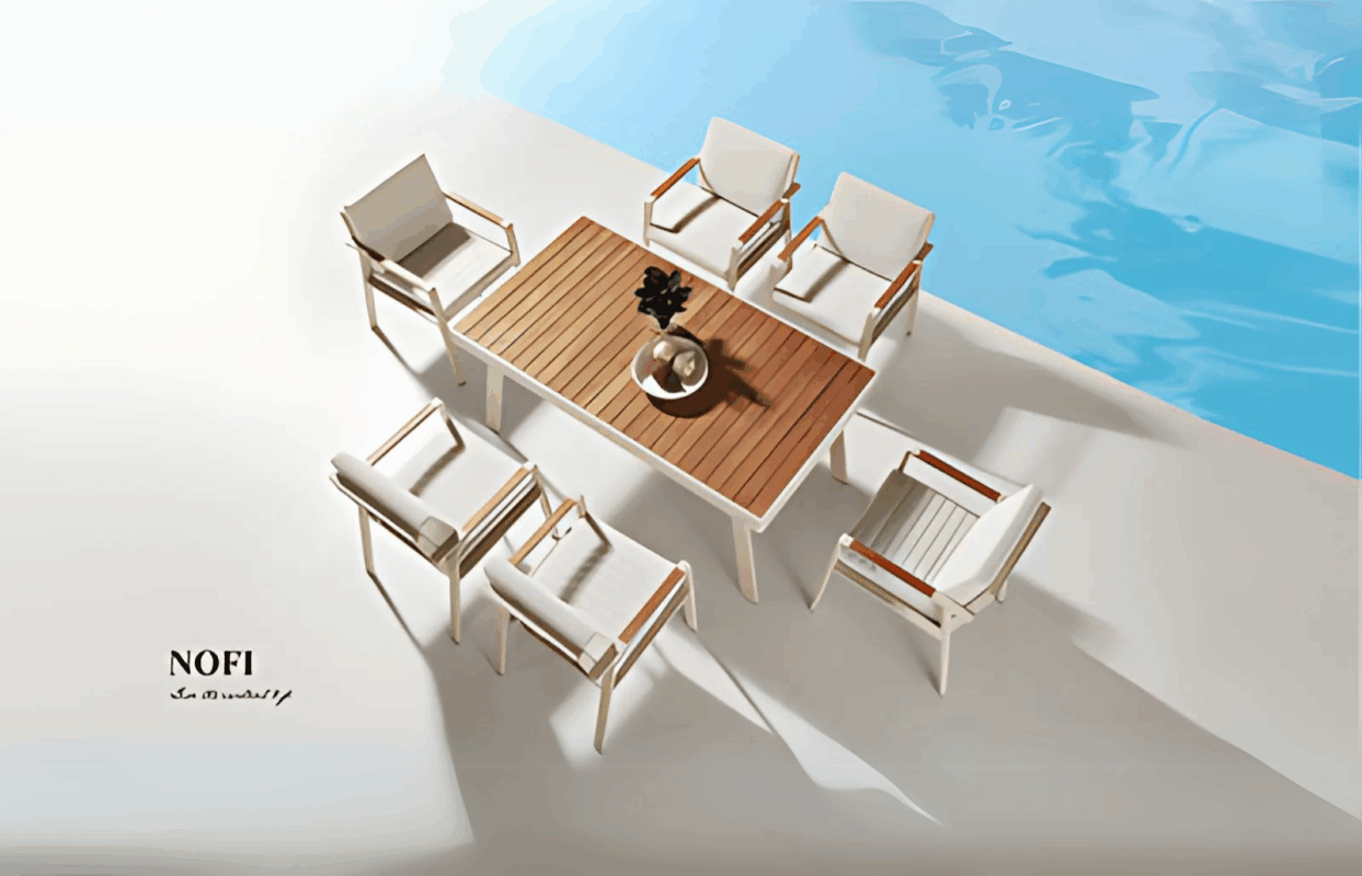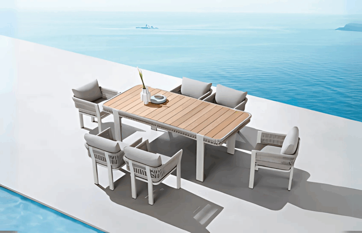 Алюминий, тик ағашы және ылғалға төзімді жастықтар оны террассалар, бақтар және кафелер үшін мінсіз етеді.